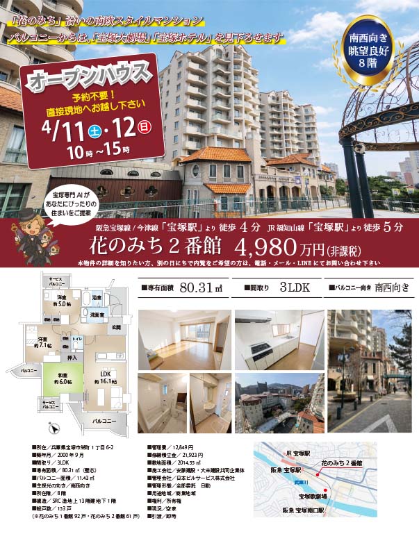 2026年4月11日(土)、12日(日)に、「花のみち2番館8階」でオープンハウスを開催します。「花のみち」沿いの南欧スタイルマンション♬バルコニーからは、「宝塚大劇場」「宝塚ホテル」を見下ろせます。※予約不要ですので、お気軽に直接現地へお越しください。