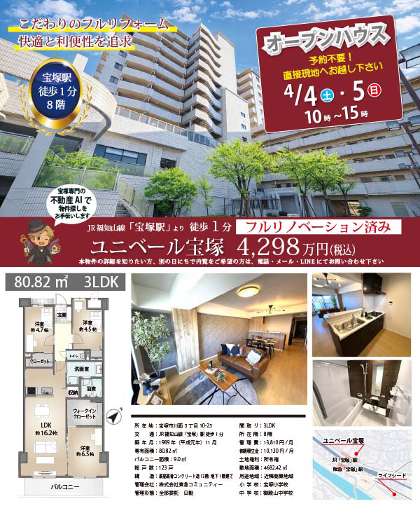 2026年4月4日(土)、5日(日)に、「ユニベール宝塚8階」でオープンハウスを開催します。価格改定4298万円(前回開催時4598万円)JR宝塚駅直結、フルリノベーションで、新築のような綺麗さです♬※予約不要ですので、お気軽に直接現地へお越しください。